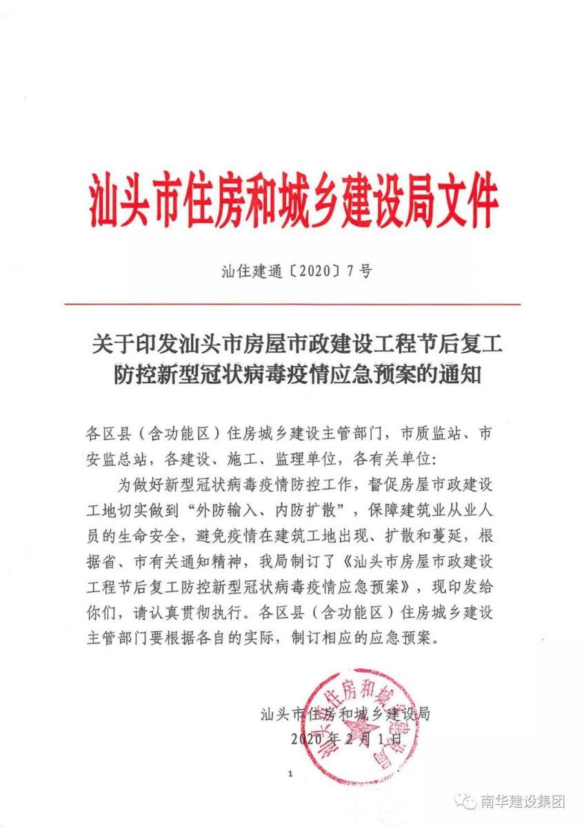 关于印发汕头市房屋市政建设工程节后复工防控新型冠状病毒疫情应急预案的通知