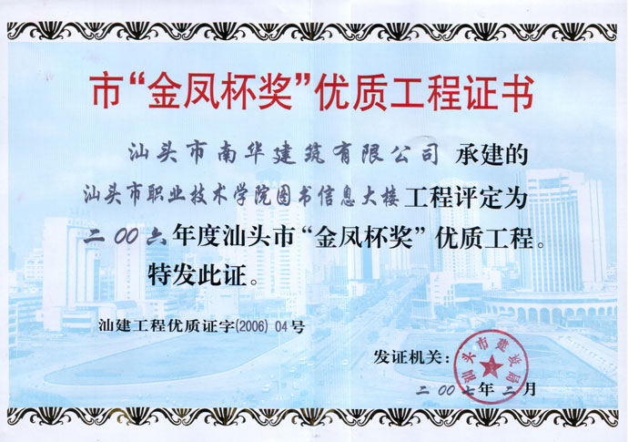 下篷中学扩建教学楼金凤杯证书